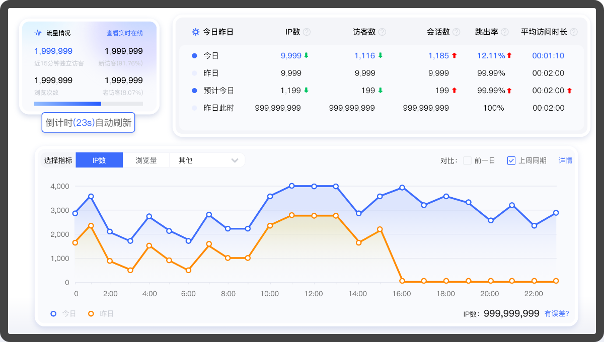 實時查看訪客來源數據,無站點及數據容量限制,可隨時查看網站歷史趨勢