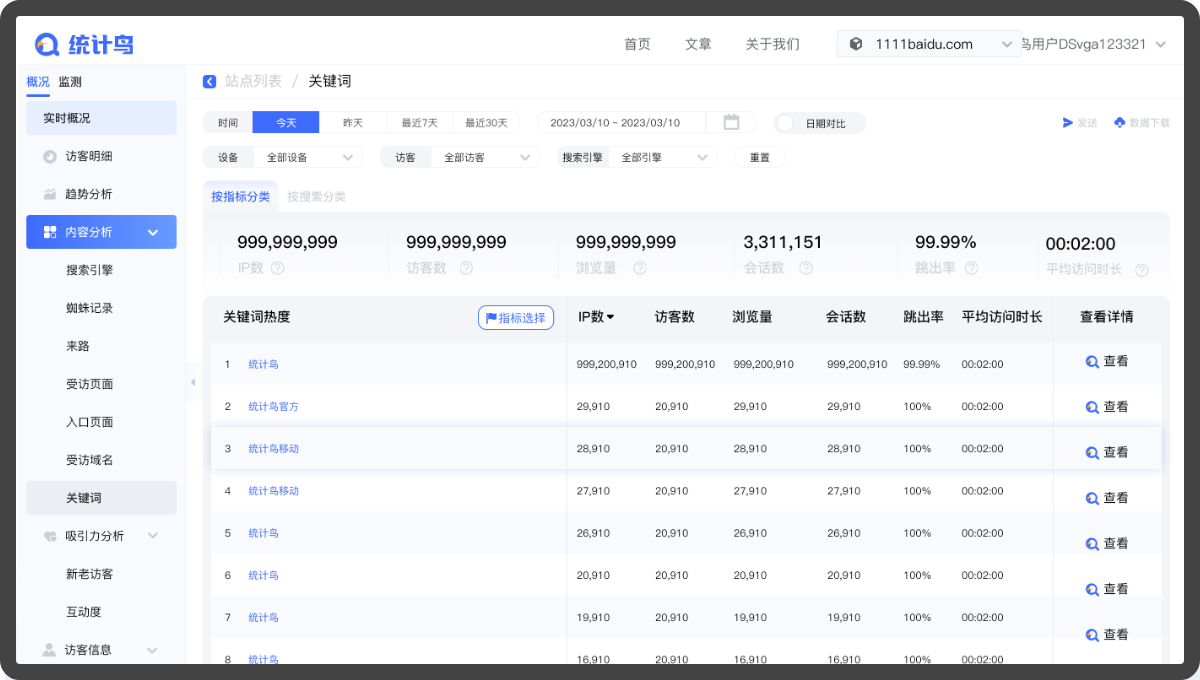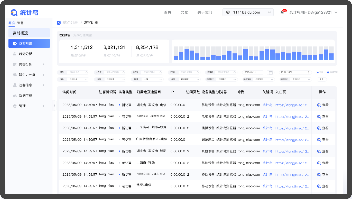 統計鳥提供了網站數據統計對比與分析,更全面地了解訪客來源,訪客質量,瀏覽行為,設備品牌和點擊習慣,網站趨勢一目了然,更高效地分析和運營網站。